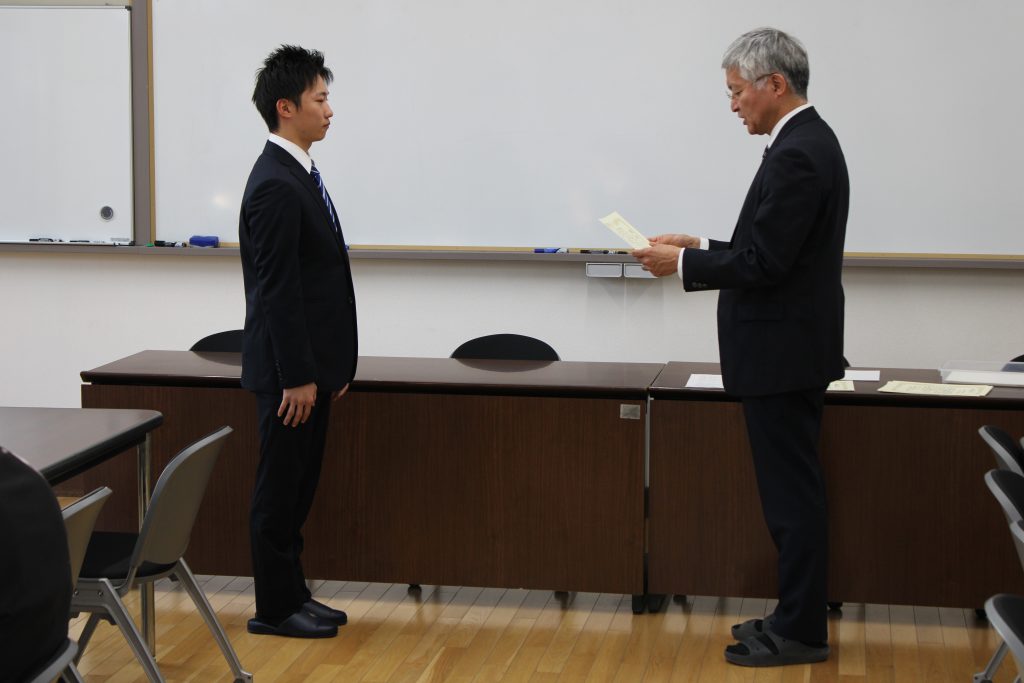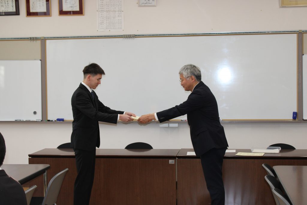 1月30日(金)に全国高等学校体育大会・全国高等学校定時制通信制体育大会でベスト8以上の成績を修めた団体または個人に対して、愛知県公立学校東三南・北地区校長会主催の表彰式が行われました。本校からは、バスケットボール部とソフトテニス部から1名ずつ表彰されました。表彰を受けた2人からは、来年度の豊富について力強いコメントを聞くことができました。